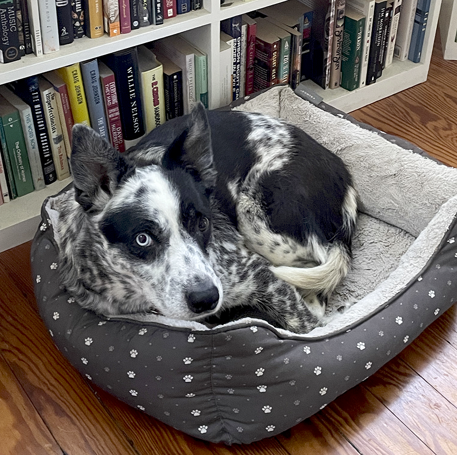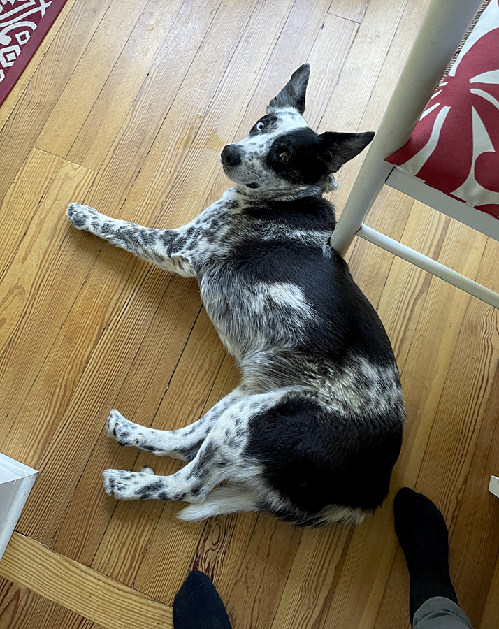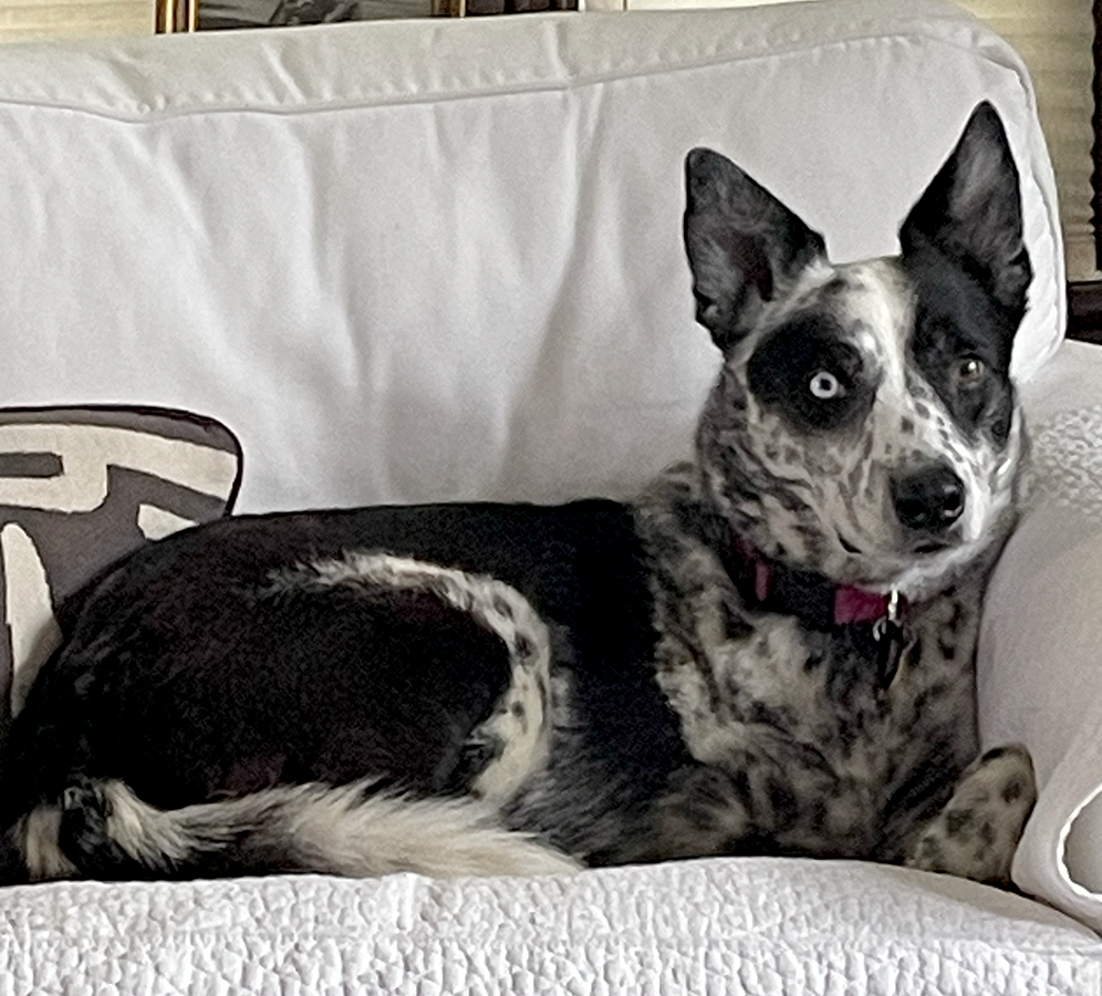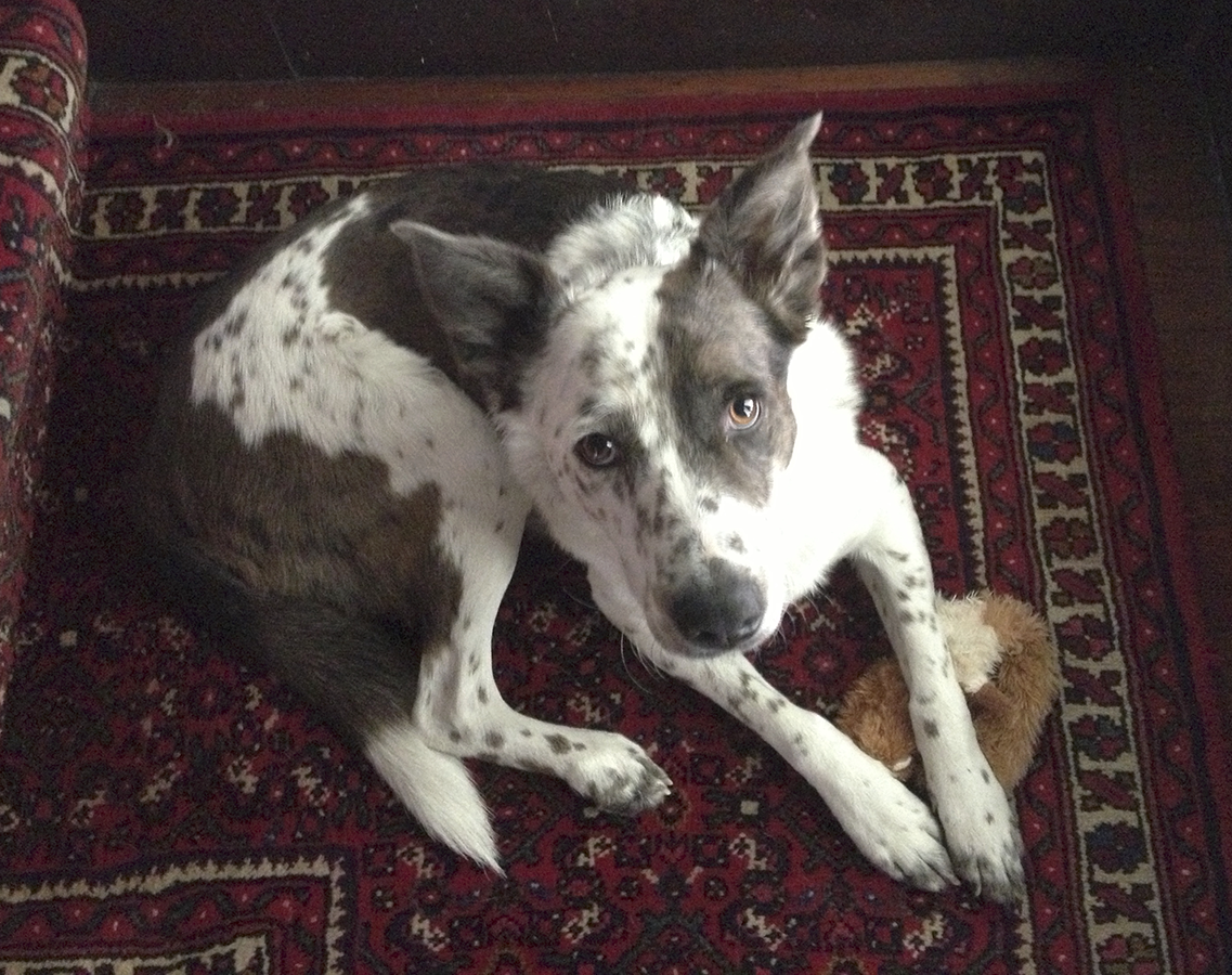 An Aussie mix, Hank was a handsome boy with golden brown eyes, pointed ears that could be deployed up or down, a harlequin face, and a luxurious soft coat of brown and white spots. He most closely resembled a breed called a Koolie, whose average age is 18 and who are never bathed, simply wiped down with a damp cloth even for show. Hank himself had just one bath in his life, when he got sprayed in the face by a skunk. He enjoyed water but only to drink; he was miraculously self-cleaning.
